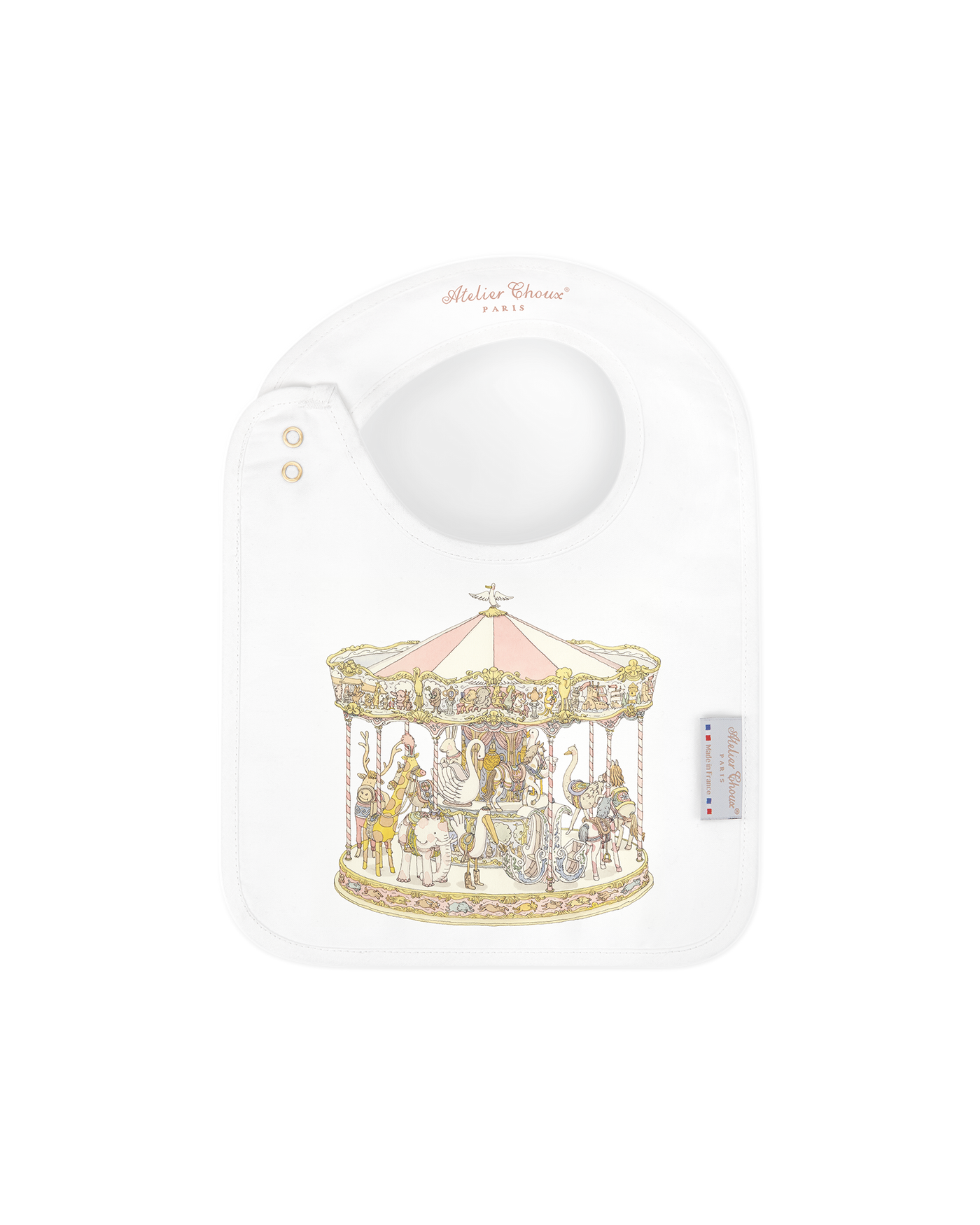 The Atelier Choux Carré & Bib Set – Carousel Pink is a refined gift set featuring our iconic Carré and a matching satin bib in a whimsical carousel-themed print. With its pastel palette and ornate detailing, this enchanting design brings the charm of a classic Parisian merry-go-round to life — offering the perfect blend of playful elegance and everyday practicality for newborns.