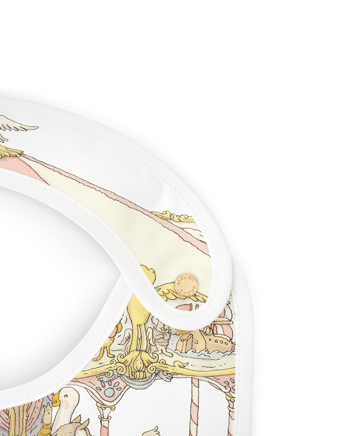 The Atelier Choux Carré is a multifunctional piece designed for elegant daily use — perfect as a swaddle, lightweight blanket, stroller accent, or decorative photo background. The Carousel Pink print features a beautifully illustrated merry-go-round with graceful swans, giraffes, horses, and charming riders, all set under a delicate canopy in soft shades of blush and golden hue.Satin Bib